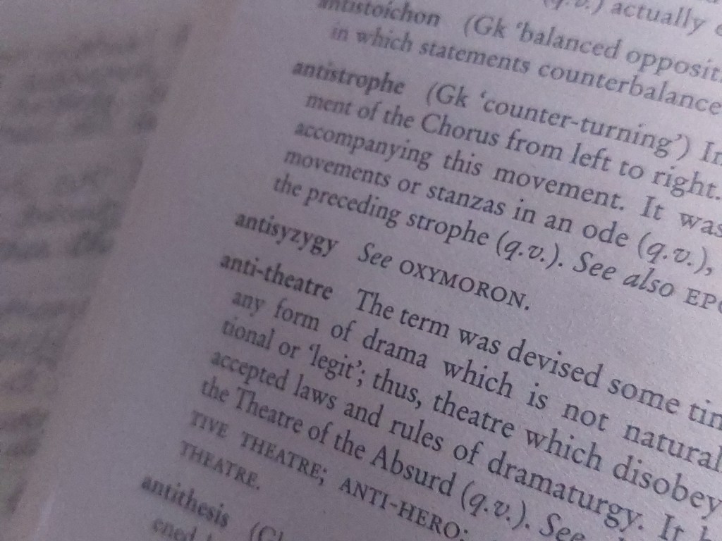 A final note on definitions of antisyzygy. The Penguin Dictionary of Literary Terms (Fourth Edition, 1999) entry says See Oxymoron, the Greek derivation of which is ‘Pointedly Foolish’.